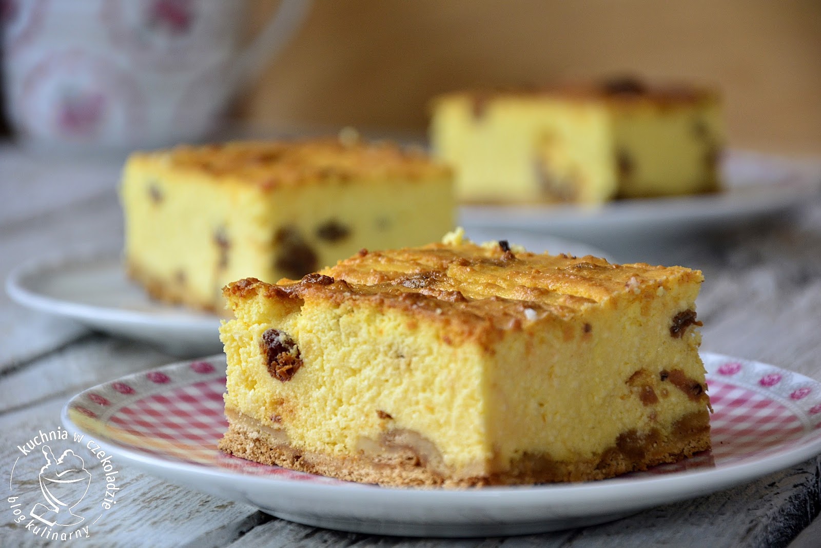 Blaszkę do pieczenia wykładamy papierem do pieczenia, a następnie herbatnikami (jeden obok drugiego). Miękkie masło ucieramy z żółtkami i cukrami. Dodajemy biały ser przeciśnięty przez praskę oraz budynie rozpuszczone w mleku. Miksujemy do połączenia składników. Białka ubijamy ze szczyptą soli na sztywną pianę i delikatnie łączymy z masą serową. Dodajemy także rodzynki. Masę wylewamy na przygotowane herbatniki i wkładamy do piekarnika nagrzanego do 170st C na 60 minut. Studzimy przy otwartych drzwiczkach, najlepiej całą noc.